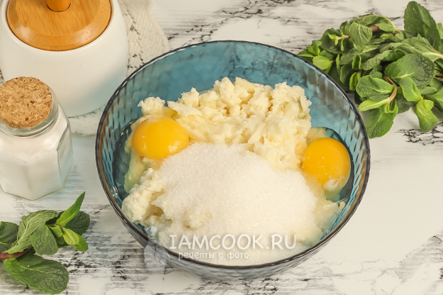 Творог любой жирности выложите в глубокую емкость и вбейте туда же куриные яйца. Всыпьте сахарный песок и соль. Влейте молоко любой жирности и тщательно перемешайте. Можно использовать погружной блендер.