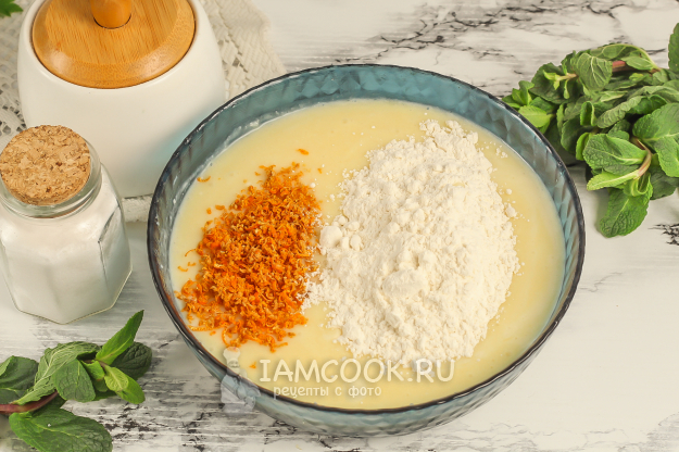 Всыпьте в массу апельсиновую цедру, ванильный сахар, разрыхлитель и пшеничную муку. Перемешайте все.