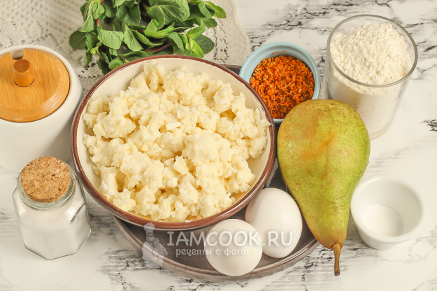 Продукты для приготовления творожной запеканки с грушей в мультиварке - перед вами!