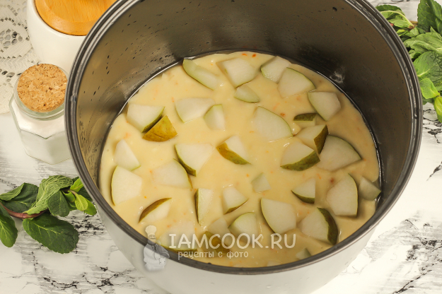 Промойте грушу в воде, разрежьте на четвертинки и срежьте семенные блоки. Нарежьте мякоть средними кубиками, но не мелкими и не крупными. Смажьте форму мультиварки растительным маслом без аромата или сливочным. Выложите в форму приготовленное творожное тесто и на него выложите кусочки груши.