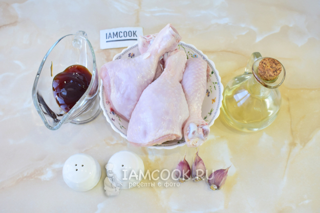 Соберите необходимые ингредиенты для приготовления куриных голеней в соусе терияки на сковороде. Промойте голени в проточной воде, а затем обсушите от лишней влаги с помощью бумажного полотенца.