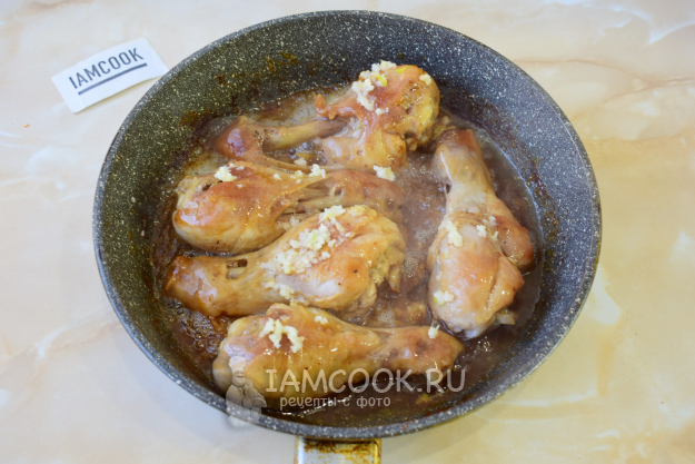 Накройте сковороду крышкой и готовьте куриные голени в соусе терияки минут 20-25. Добавьте немного соли и специй.