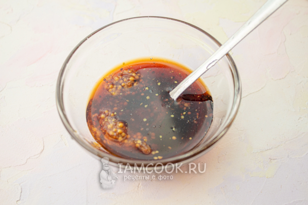 Приготовьте маринад. Смешайте оливковое масло, мед, горчицу и соевый соус.