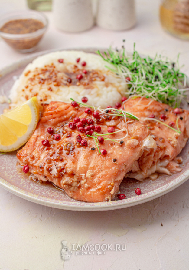 Лосось в медово-горчичном соусе готов! Оставьте рыбу в форме минут на 5-7, а затем подавайте с чем любите, у меня - отварной рис. Очень вкусно и полезно!