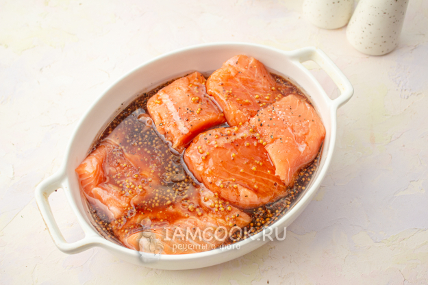 Все необходимые продукты для запекания лосося в медово-горчичном соусе - перед вами.