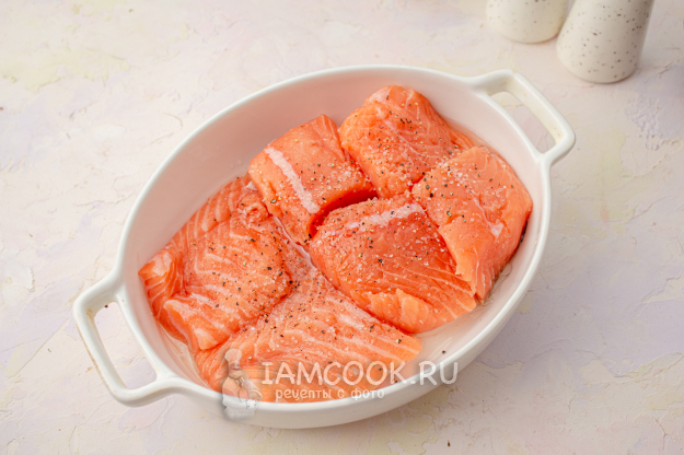 Рыбу нарежьте на порционные кусочки. Форму для выпечки смажьте оливковым маслом, выложите кусочки рыбы, посолите и поперчите.