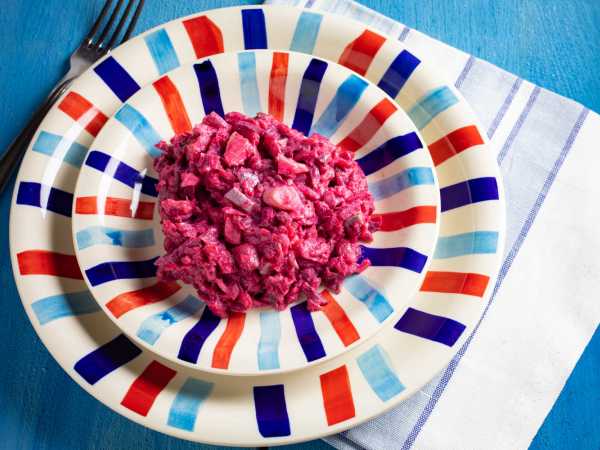 Остывшего тунца порвите руками, выложите в середину тарелки. Если не переварите рыбу, она будет слегка розовой внутри.