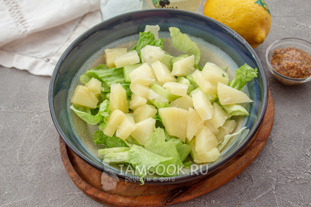 Консервированные ананасы без сиропа нарежьте небольшими кусочками, добавьте в салатник.