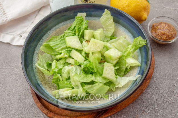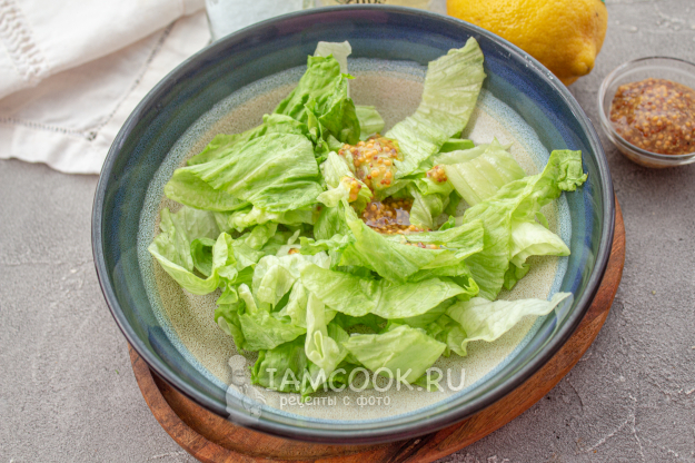 Листья салата порвите на кусочки, выложите в салатник. Добавьте примерно треть приготовленного соуса, перемешайте с салатом.