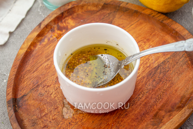 Первым делом приготовьте заправку. Смешайте хорошо все ингредиенты.