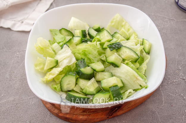 Свежий огурец нарежьте небольшими кусочками, добавьте к салату.