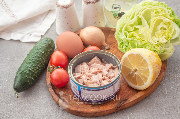 Все необходимые продукты для салата с консервированным тунцом и айсбергом (с яйцом и огурцом) - перед вами.