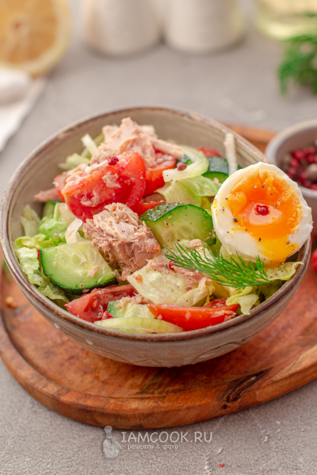 Салат переложите в салатник для подачи и добавьте половинку отварного яйца. Подавайте сразу - салат с тунцом и айсбергом с яйцом и овощами готов к дегустации.