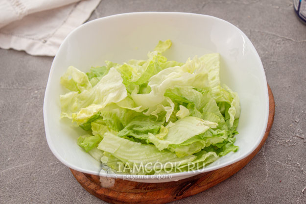 Листья салата нарежьте или порвите на кусочки, переложите в салатник.