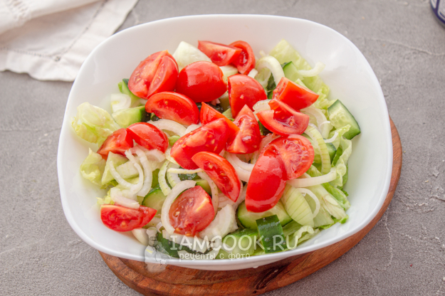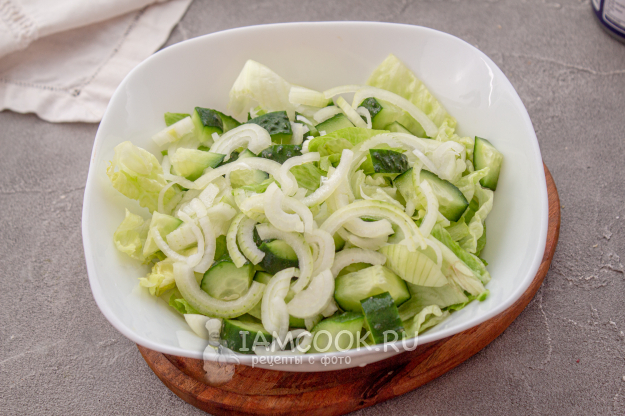 Лук нарежьте тонкими перьями, добавьте в салатник. Если любите более пикантный вкус, то лук можно замариновать в уксусе.