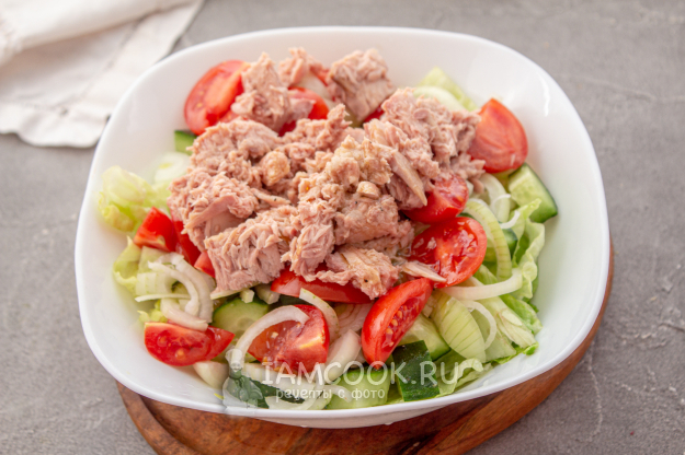 Добавьте кусочки тунца и заправьте салат приготовленным соусом. Аккуратно перемешайте.