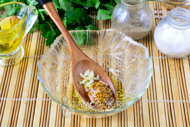 Приготовьте соус: смешайте оливковое масло с дижонской горчицей, добавьте по вкусу чеснок. Чеснок выдавите через пресс или натрите на мелкой терке. Соус перемешайте.