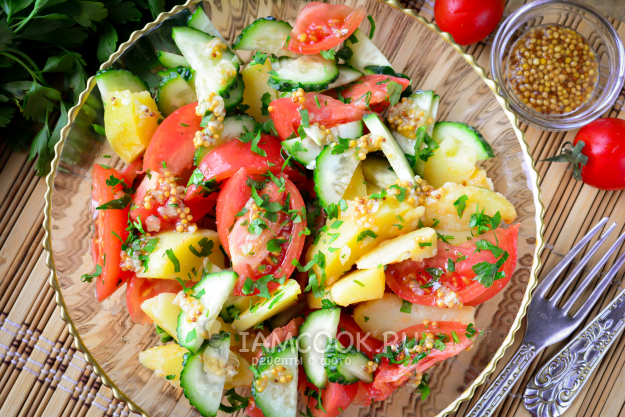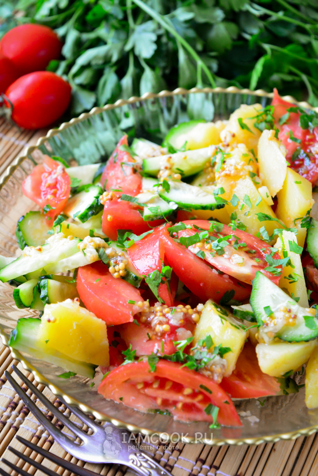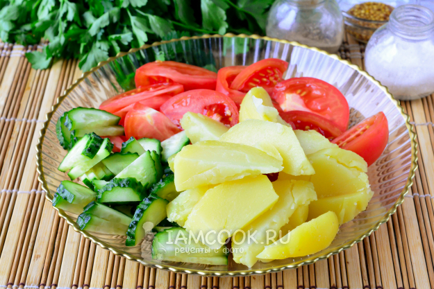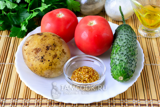 Подготовьте все необходимые ингредиенты для салата из помидоров, огурцов и картошки по списку.