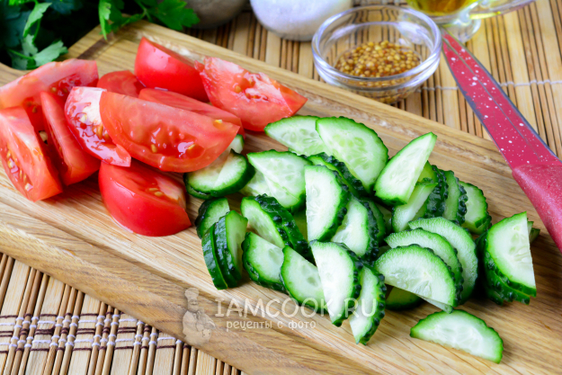 Свежие овощи сполосните, огурцы и помидоры нарежьте средними ломтиками или дольками.