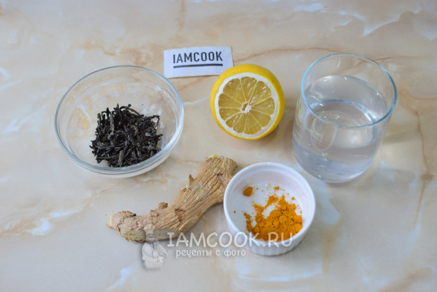 Соберите все продукты для приготовления чая с имбирём, куркумой и лимоном.