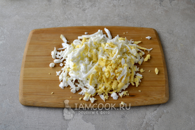 Один куриный белок и яйцо натрите на терке.