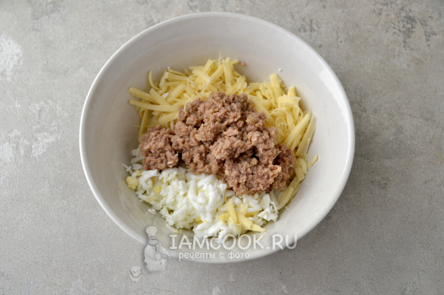 В миску положите натертые сыр и яйца, добавьте консервированного тунца и заправку. Если тунец - кусочками, разомните его вилкой.