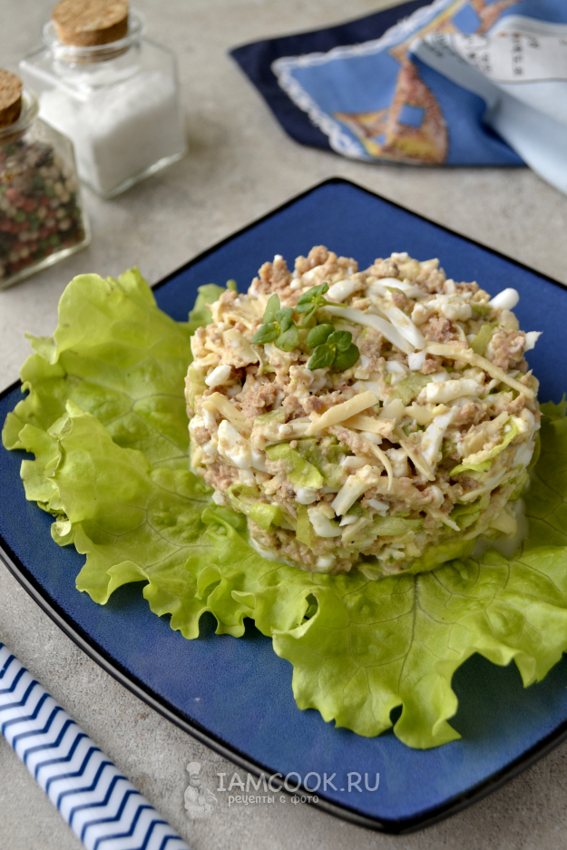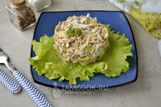 Салат можно подать в таком виде, а лучше с использованием кулинарного кольца. На плоскую тарелку положите листья салата, поставьте кольцо и заполните его подготовленным кето салатом из тунца с яйцом и сыром.