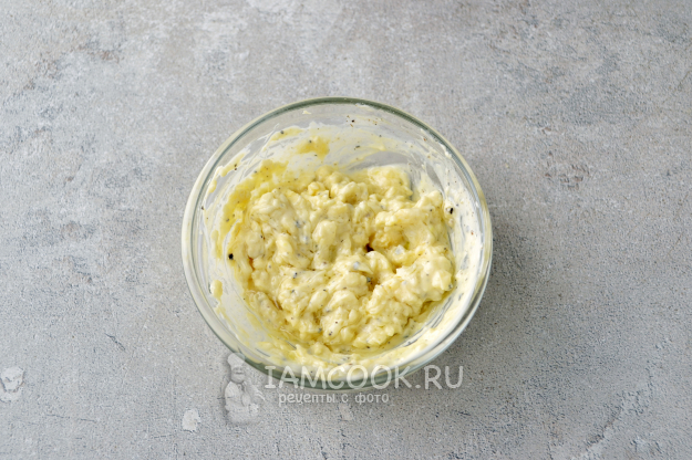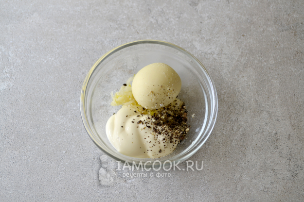 Для заправки салата соедините в небольшой мисочке один куриный желток, майонез, пропущенный через пресс чеснок и черный молотый перец.