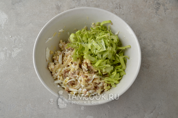 Листья салата вымойте, обсушите и нарежьте соломкой. Добавьте салатные листья в миску. Аккуратно перемешайте все ингредиенты.