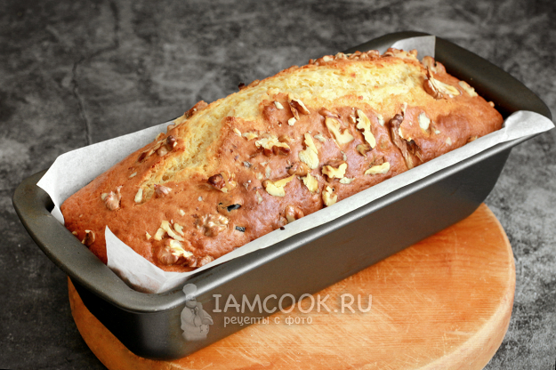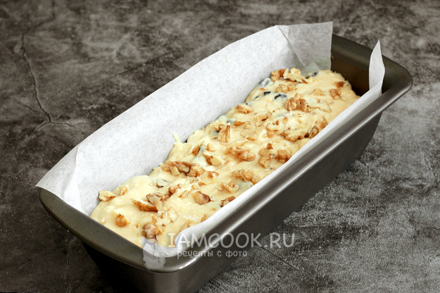 Форму смажьте сливочным маслом или выстелите пергаментом. Распределите тесто по форме, оно может получиться у вас чуть гуще. Поверхность посыпьте дроблеными орехами (берите любые). Выпекайте кекс на среднем уровне около часа. Если верх начнет быстро румяниться, то накройте его фольгой. Фольгу я подкладываю и под форму, поэтому регулируйте выпечку по своей духовке.