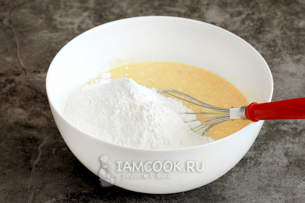 Просейте муку с разрыхлителем, соедините с тестом.