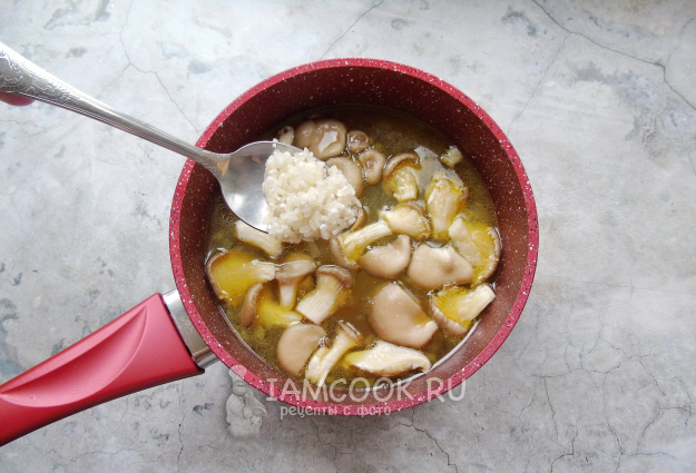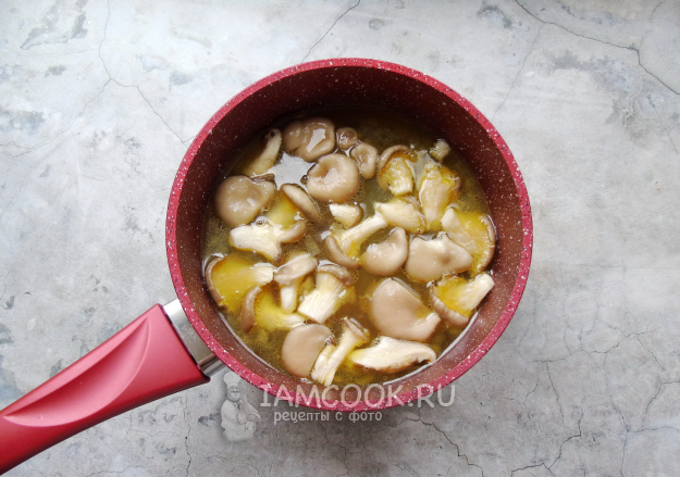 У вешенок обрежьте корни, помойте и нарежьте грибы. Мелкие можно не нарезать. Добавьте в кастрюлю. Вообще, для этого супа подойдут любые грибы.