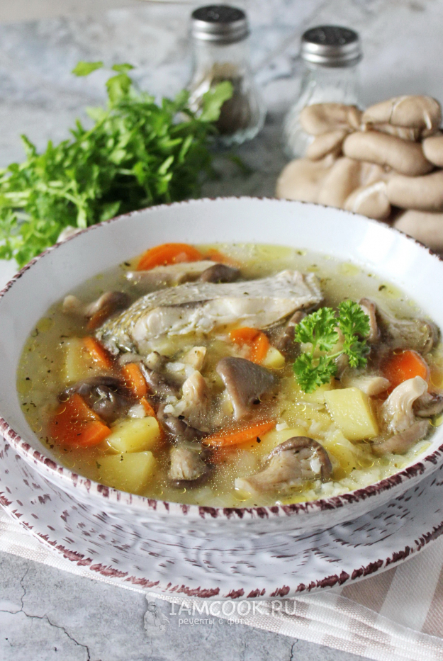 Рыбный суп с грибами готов. При подаче в тарелку выложите отварную рыбу.