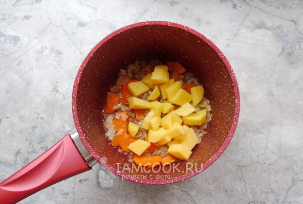 Картофель очистите, помойте и нарежьте. Добавьте в кастрюлю.