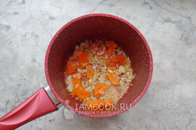 Лук и морковь очистите и помойте. Нарежьте произвольно и выложите в кастрюлю. Налейте подсолнечное масло и припустите овощи на небольшом огне до прозрачности лука. У кого обычная кастрюля, сделайте это на сковороде.