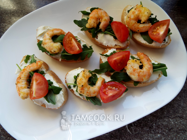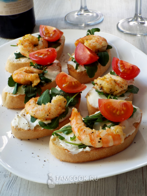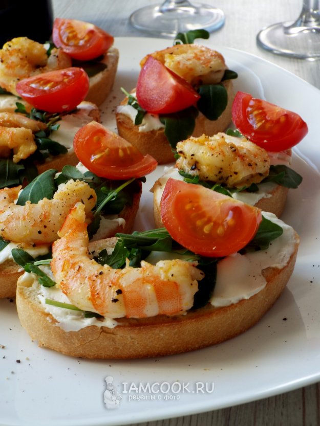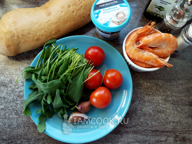 Вот такие ингредиенты я взяла, чтобы приготовить брускетту с творожным сыром и креветками.