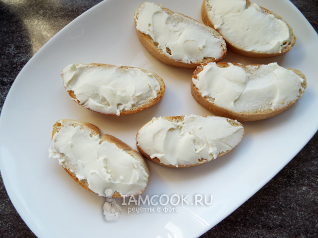 Батон или чиабатту нарезать. Подсушить в тостере или на сковороде.