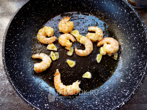 Креветок почистить. В сковороду налить масло и нарезать чеснок, обжарить креветок буквально 30 секунд с обеих сторон.