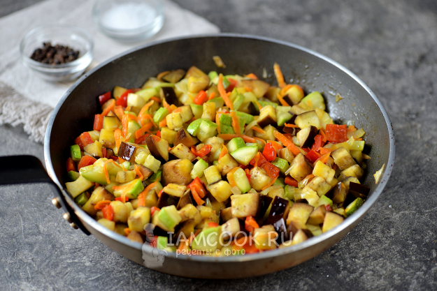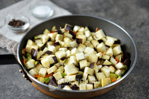 Дальше нарежьте баклажан мелким кубиком, переложите в сковороду. Теперь нужно помешивать овощное рагу чуть чаще, поскольку баклажан впитает всю жидкость со сковороды. Подливайте понемногу воду из чайника, тушите овощи минут 5.