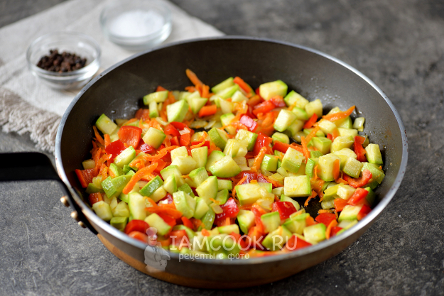 Удалите хвостик на кабачке, очистите болгарский перец от семечек и плодоножки, нарежьте кубиком. Переложите нарезанные овощи в сковороду, тушите на тихом огне минуты 3.
