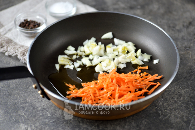 Лук, морковь и чеснок почистите, помойте вместе с остальными овощами и зеленью, обсушите. Влейте в сковороду растительное масло, положите в него нарезанный мелким кубиком лук и натертую на крупной терке морковь. Обжарьте их минуты 2 на умеренном огне.