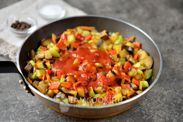Влейте томатное пюре, добавьте еще немного воды.