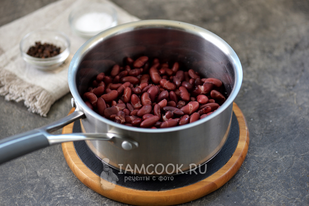 Отварите фасоль в чуть подсоленной воде до готовности, в зависимости от сорта это может занять от 45 минут до 1,5 часов. Время от времени пробуйте одну фасолину на вкус, чтобы не сильно разварить ее. Если очень хочется уменьшить время ее варки, тогда всыпьте в воду щепоть соды.