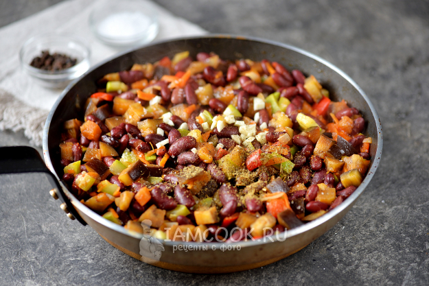 Переложите в сковороду отварную фасоль, добавьте рубленый чеснок, хмели-сунели, соль и перец по вкусу. Перемешайте содержимое сковороды, подлейте еще немного воды, тушите 5 минут.