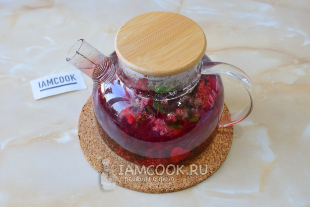 Залейте все ингредиенты очень горячей водой, закройте крышкой и оставьте постоять на 5-7 минут. За это время чай успеет завариться и станет красивого яркого цвета. Чтобы чай не остывал при заваривании, укутайте чайник полотенцем.