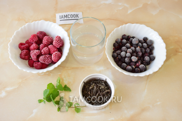 Соберите всё необходимое для приготовления чая с малиной и черной смородиной. Ягоды можно брать свежие или замороженные. Воду доведите до кипения.