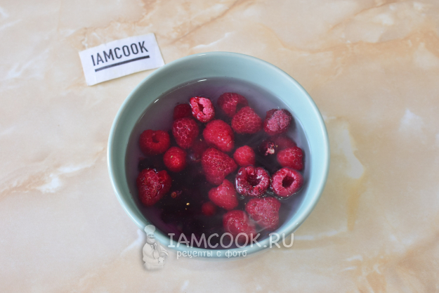 Малину и черную смородину сложите в чашу и залейте кипятком. Если ягоды свежие, то сразу слейте. Если ягоды замороженные, то оставьте на 15 секунд и слейте. Они успеют разморозиться.
