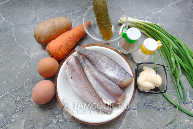 Возьмите все ингредиенты для приготовления салата с отварным хеком.