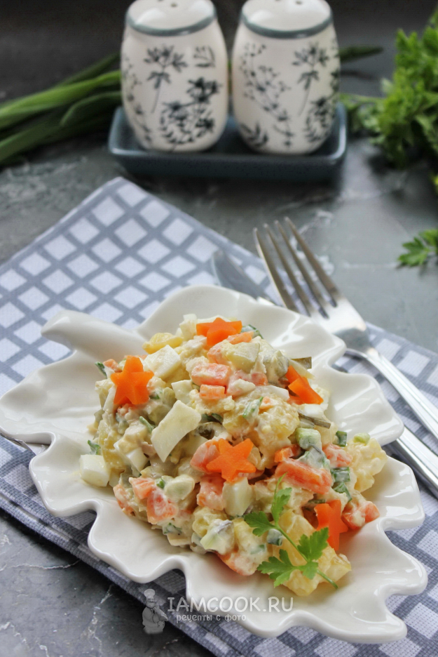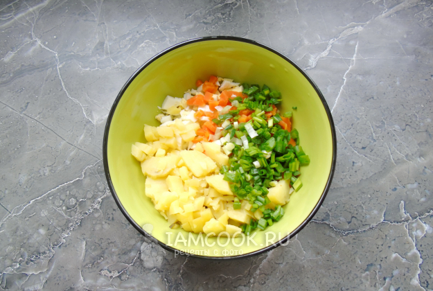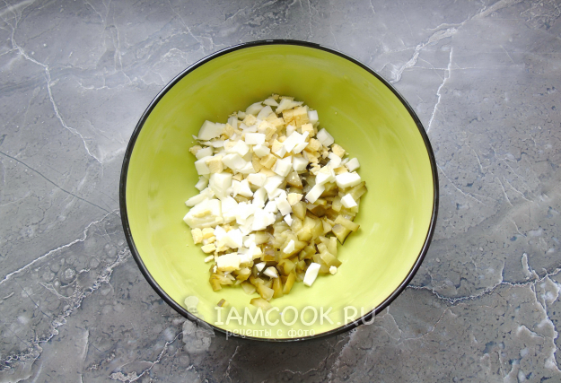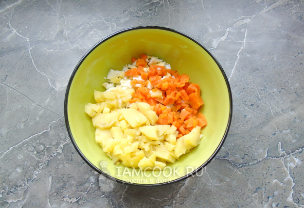 Вареный картофель и морковь очистите и нарежьте кубиками, добавьте в салат.