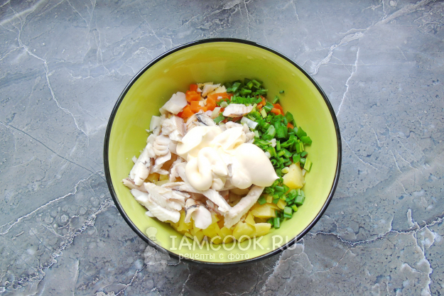 Добавьте отварного хека в салат. Особенно измельчать рыбу не нужно. В процессе перемешивания кусочки рыбы станут меньше.